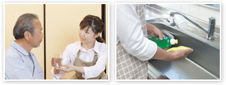 ○掃除・・利用者の居室の掃除を行います。(利用者の居室以外の居室、庭等の敷地の掃除は行いません。) ○洗濯・・利用者の衣類等の洗濯を行います。(ご家族分の洗濯は行いません。) ○一般的調理・・利用者のための一般的な調理、配膳片付けを行います。(ご家族分の調理は行いません。) ○買い物・・利用者の日常生活に必要となる物品の買い物、受け取りを行います。(預金・貯金の引き出しや預け入れは行いません。) |